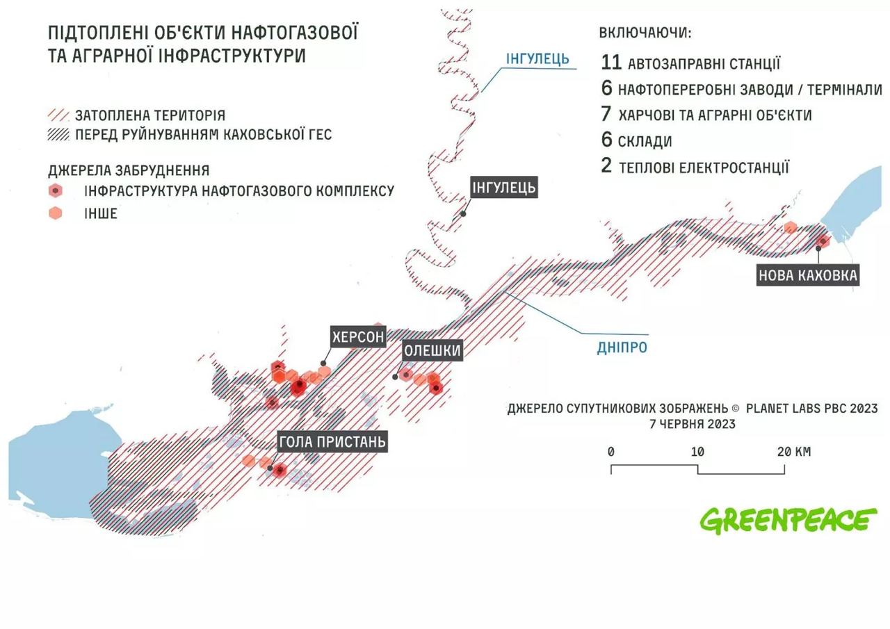 Организация провела исследование на основе спутниковых данных. Оно показало, что были затоплены нефтеперерабатывающие заводы, автозаправочные станции, теплоэлектростанции и склады — совокупно 32 объекта. Также по меньшей мере 150 тонн моторной смазки, по предварительной информации, утекло в воду в первые дни катастрофы.