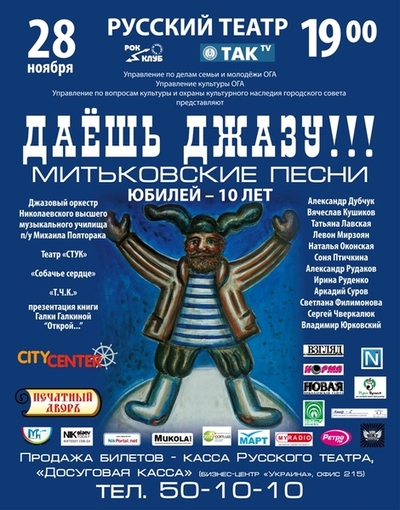 В понедельник, 28 ноября, в 19.00 в Николаевском академическом художественном русском драматическом театре под лозунгом “Даешь джазу!!!” состоится десятый юбилейный фестиваль "Митьковские песни". Генеральный продюсер всех фестивалей “Митьковские песни” в Николаеве Александр Карпенчук рассказал порталу MK.mk.ua о том, что ждёт зрителей в течении трёх часов фестиваля. По его словам, в этом году ему не удалось привезти на мероприятие одного из организаторов творческой группы “Митьки” питерского художника Дмитрия Шагина, и именно поэтому долгое время дата фестиваля переносилась, так как до конца не был решен вопрос с приездом столь почетного гостя.
