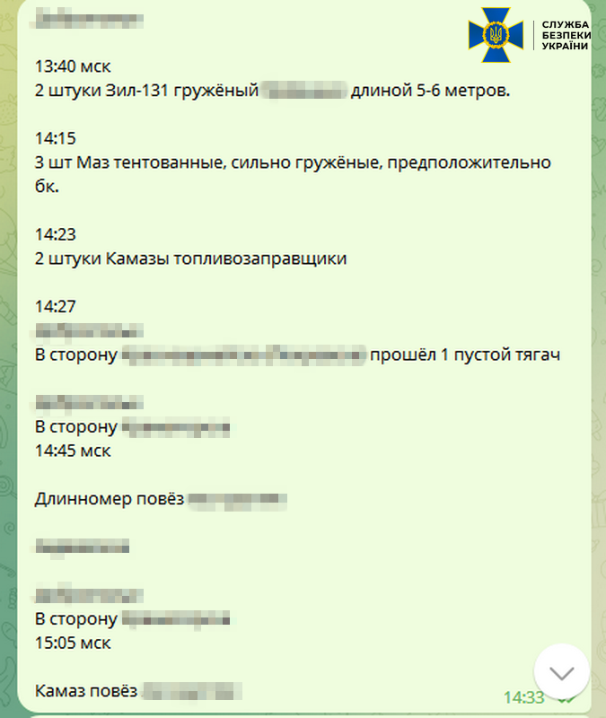 — В зоне особого внимания фигуранта были колонны тяжелой и специальной техники. В частности, самоходные артустановки, грузовики с боеприпасами и топливозаправочные автомобили, задействованные в контрнаступлении Сил обороны, говорится в сообщении.