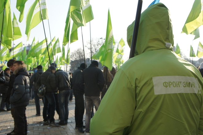 Люди на митинге держали флаги политических партий «Фронт змін» и «Батьківщина», а также транспаранты с различными лозунгами, один из которых: «Украина против Януковича».