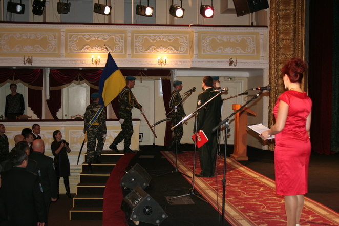 В начале под звуки оркестра на сцену был торжественно вынесен государственный флаг. После этого ведущие торжества поздравили всех присутствующих, и пригласили на сцену командира 79-й Николаевской отдельной аэромобильной бригады Командования Сухопутных войск ВС Украины полковника Юрия Александровича Клята.