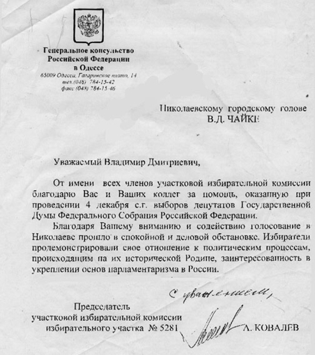 И вот на днях на имя городского головы Владимира Чайки пришло благодарственное письмо, в котором председатель участковой избирательной комиссии, консул-советник Генерального консульства РФ в Одессе Анатолий Ковалев выражает благодарность за помощь в организации голосования на территории нашего города. Об этом сообщили на официальном сайте Николаевского городского совета.