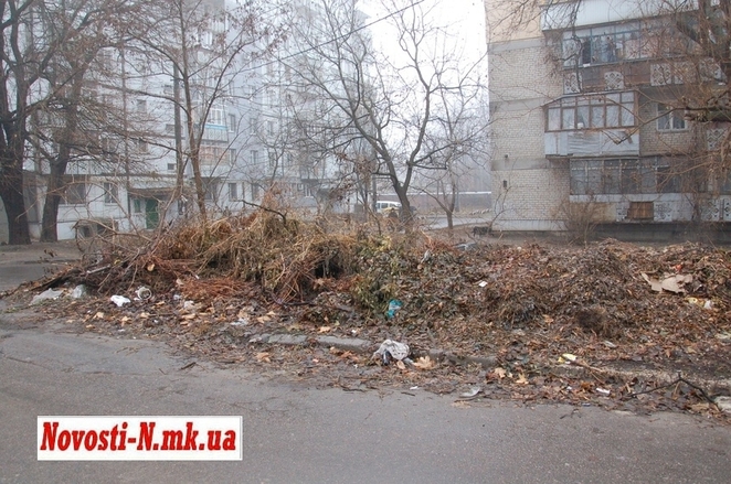 Коммунальщики сгребли чуть ли не со всего квартала опавшую листву на одну огромную кучу, которая, кстати, просто таки завалила детскую песочницу во дворе. К ней также добавились кем-то выброшенные коробки, части старой мебели, доски и прочий мусор. Добавили «эстетического» вида и работники «Николаевоблэнерго», которые спилили мешавшие линиям электропередач ветки и бросили их тут же, под деревьями.