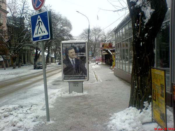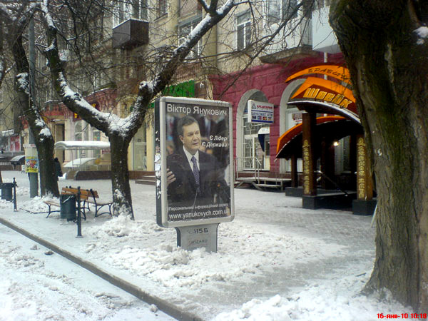 На центральной улице города – улице Советской, все прохожие могут видеть «сити-лайты» на которых изображен кандидат в Президенты от Партии регионов Виктор Янукович.