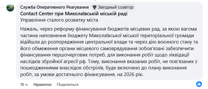 «К сожалению, из-за реформы финансирования бюджетов местных советов, по которой весомая часть наполнения бюджета Николаевской городской территориальной громады отошла в распоряжение центральной власти и из-за действия военного положения и его ограничения органы местного самоуправления обязаны обеспечить финансирование первоочередных потребностей, для выполнения работ по ликвидации последствий вооруженной агрессии РФ. Поэтому, выполнение указанных работ, не связанных с повреждениями в результате обстрелов, будет включено в план выполнения работ, при условии достаточного финансирования, на 2026 год», — отметили в управлении устойчивого развития.