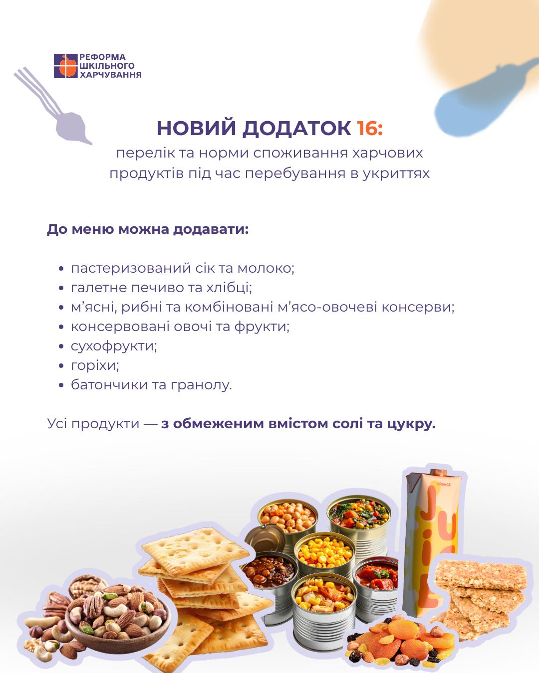 В меню для укрытий разрешено включать пастеризованные напитки, хлебцы, галетное печенье, консервы, сухофрукты, орехи, батончики и гранолу — при условии, что продукты содержат ограниченное количество соли и сахара.