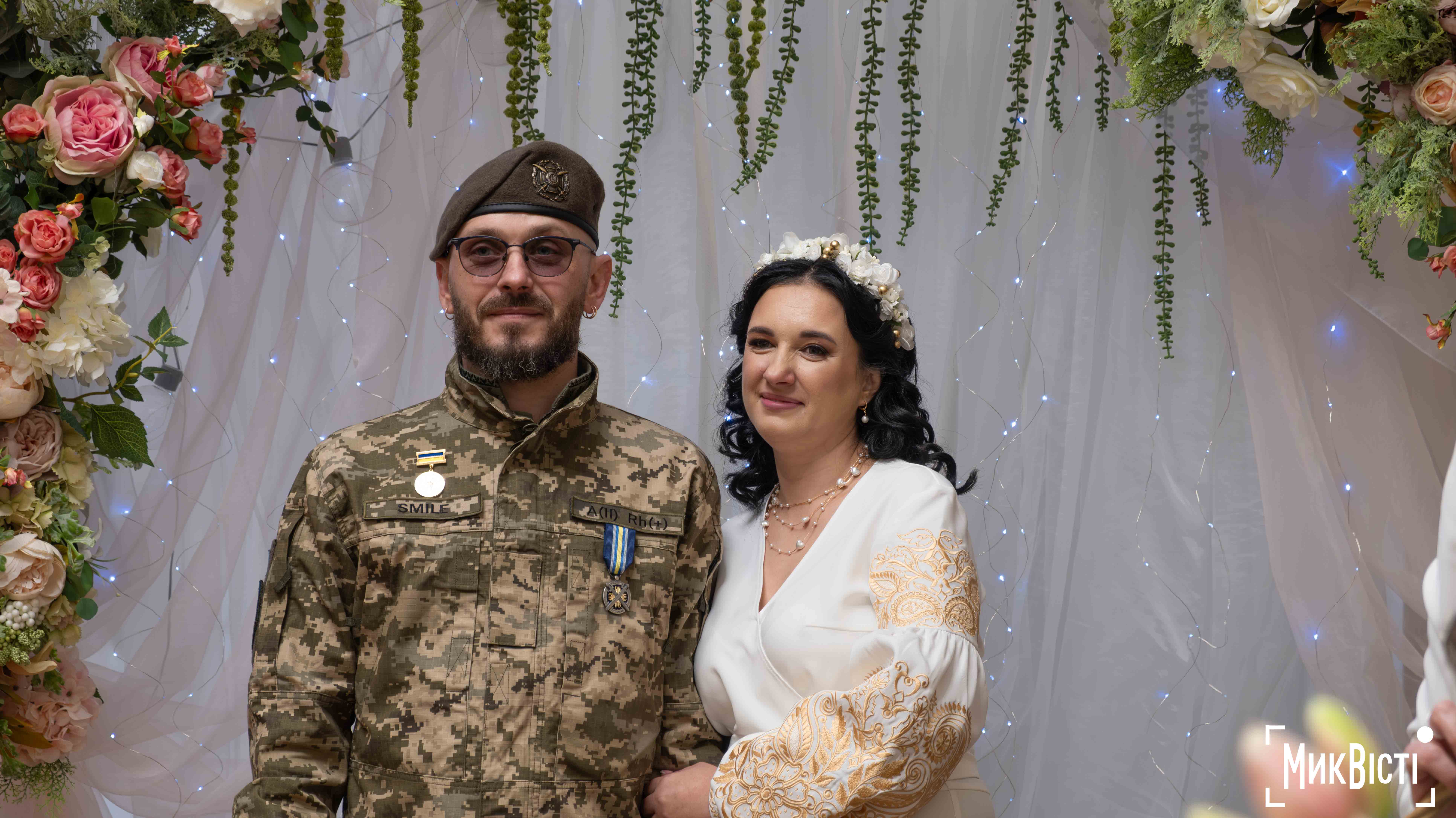 Наиболее эмоциональной стала церемония пары военного 123-й отдельной бригады территориальной обороны Игоря и его невесты Оксаны. Пара познакомилась год назад и сегодня официально стала супругами.