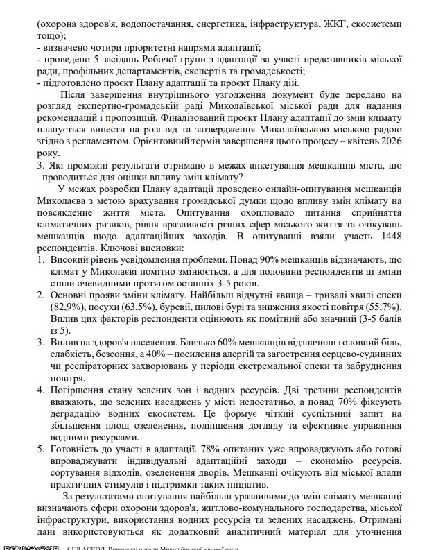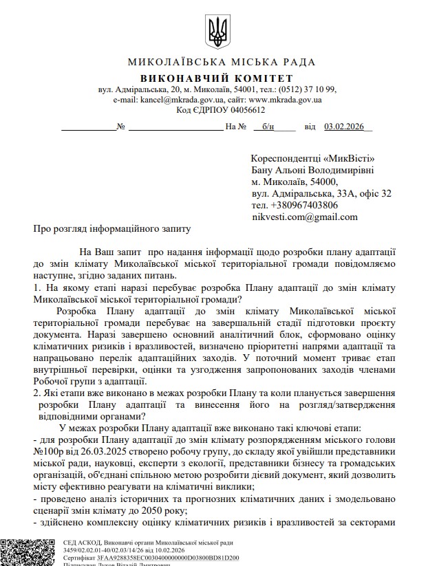 Разработка Плана адаптации к изменениям климата Николаева находится на финальной стадии. Основной аналитический блок уже завершен, и сейчас документ проходит внутреннее согласование. Ориентировочно весь процесс планируется завершить к апрелю 2026 года.