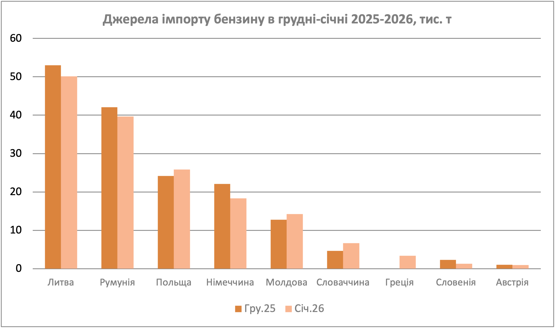 В январе 2026 года объемы импорта бензина в Украину увеличились на 70% по сравнению с аналогичным периодом прошлого года.