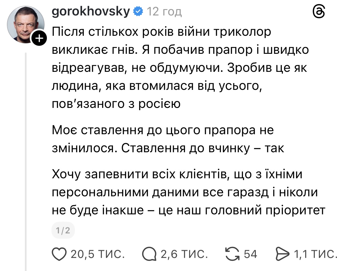 «После стольких лет войны триколор вызывает гнев. Я увидел флаг и быстро отреагировал, не обдумывая. Сделал это как человек, который устал от всего, связанного с Россией. Мое отношение к этому флагу не изменилось. Отношение к поступку — да», — написал Олег Гороховский.