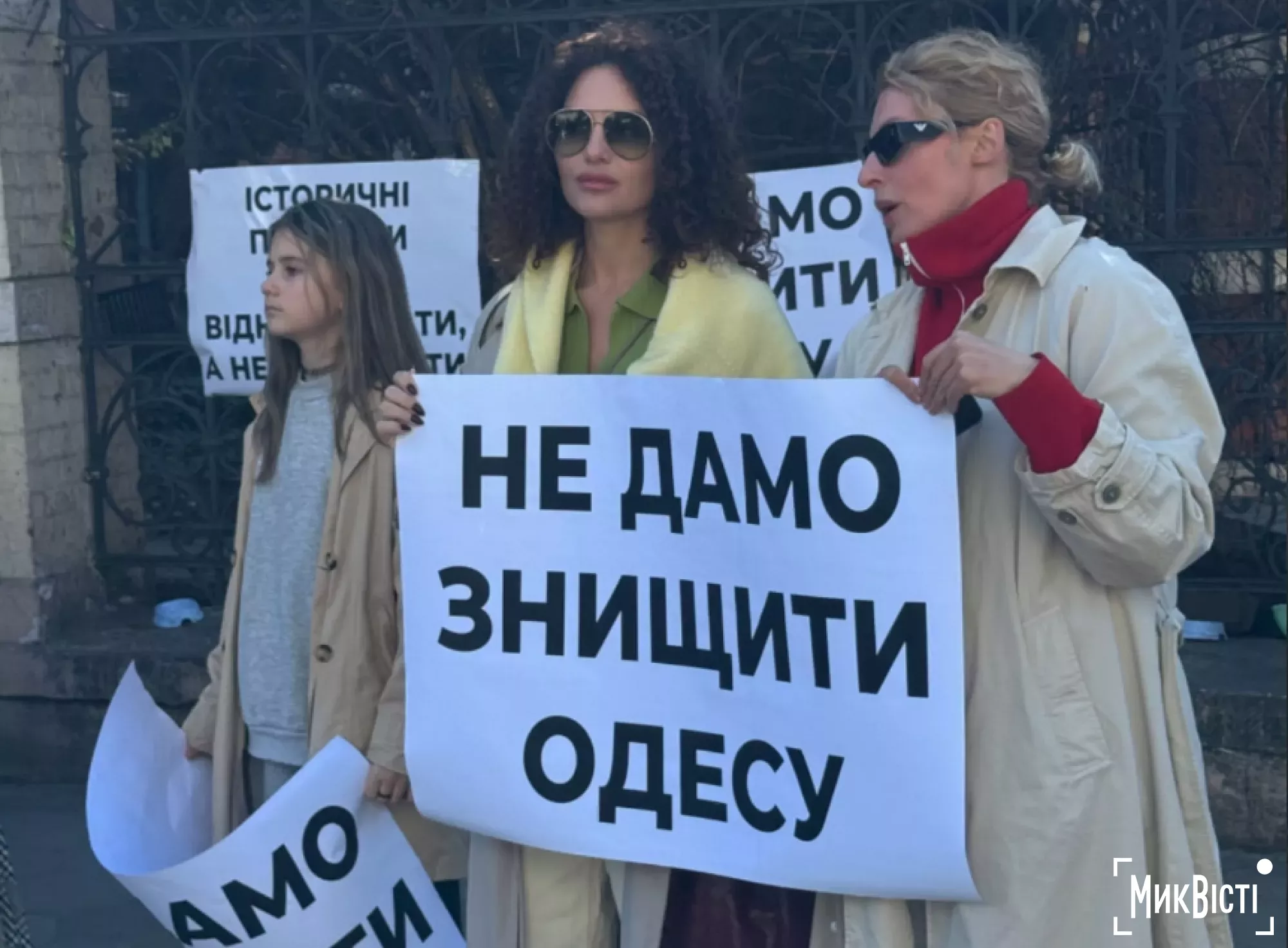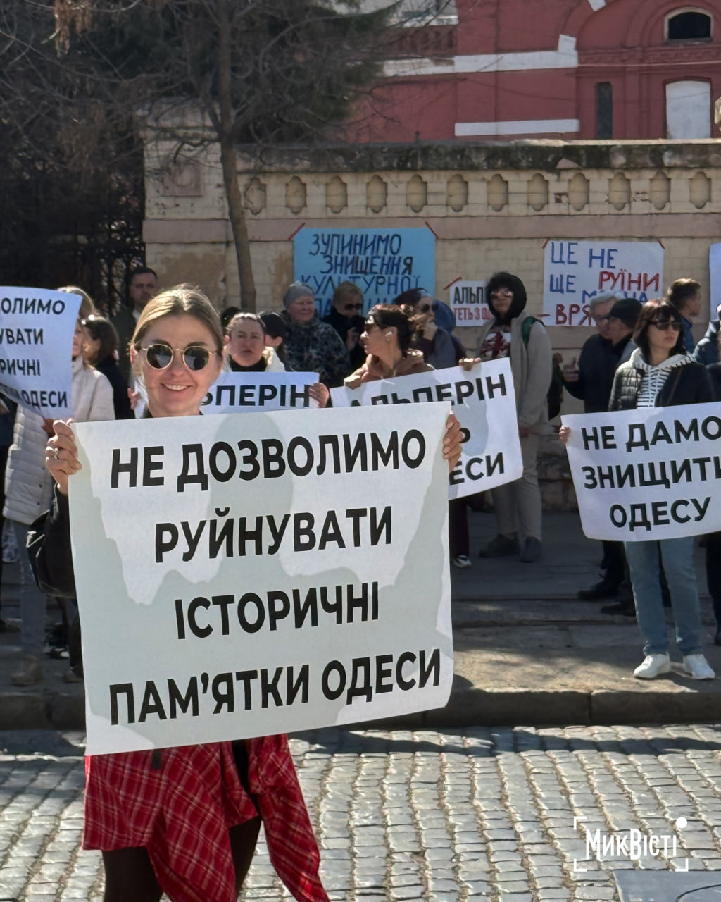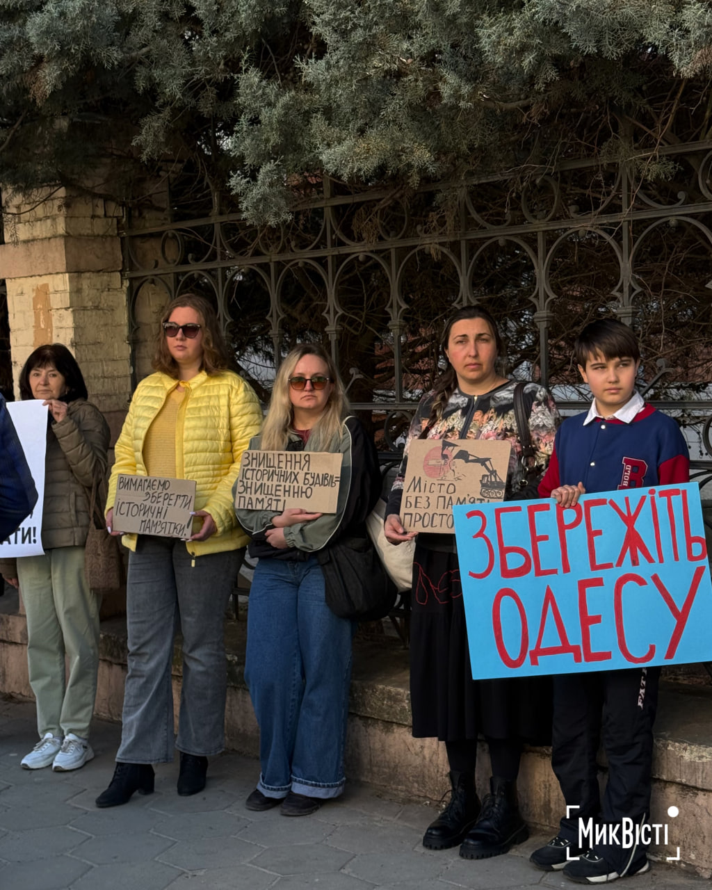 Участники акции держали плакаты и скандировали: «Не дадим уничтожить Одессу», «Одесса — наш дом, мы в нем живем», «Одесситы любят свой город», «Незаконной застройке — нет», «Исторические памятники нужно восстанавливать, а не разрушать», пишет «НикВести».