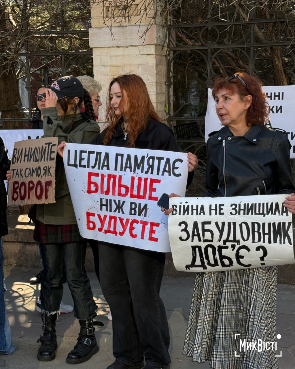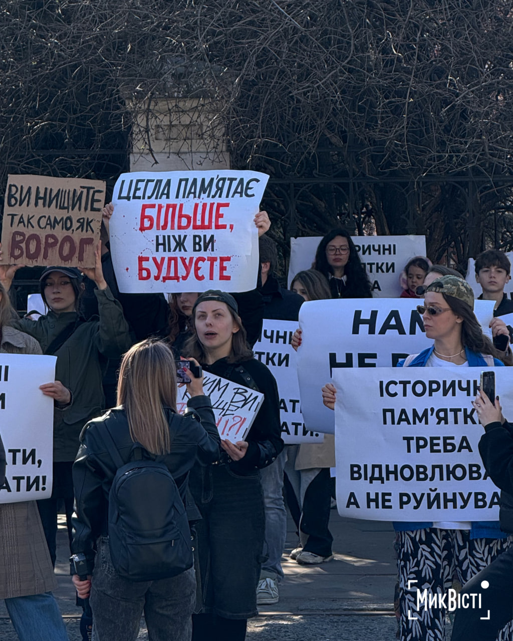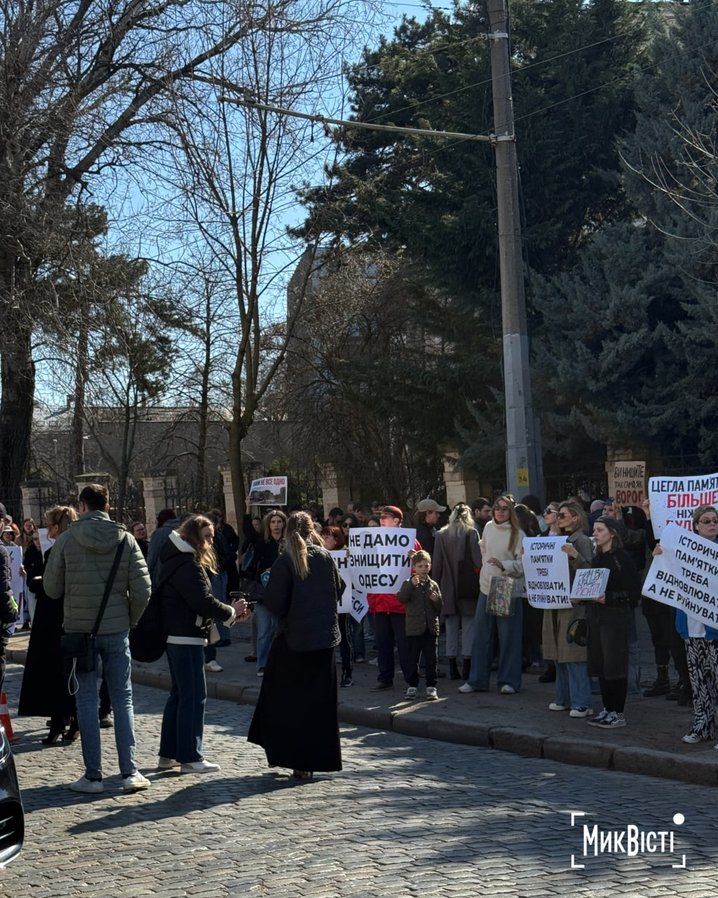 Участники акции держали плакаты и скандировали: «Не дадим уничтожить Одессу», «Одесса — наш дом, мы в нем живем», «Одесситы любят свой город», «Незаконной застройке — нет», «Исторические памятники нужно восстанавливать, а не разрушать», пишет «НикВести».