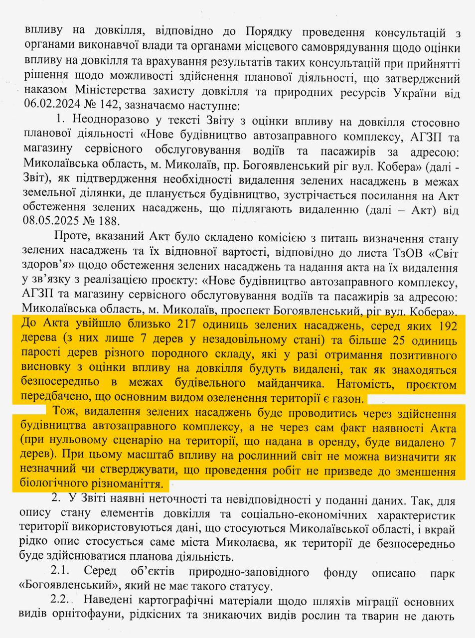 «Таким образом, удаление зеленых насаждений будет проводиться в связи с осуществлением строительства автозаправочного комплекса, а не из-за самого факта наличия Акта (при нулевом сценарии на территории, предоставленной в аренду, будет удалено 7 деревьев). При этом масштаб воздействия на растительный мир нельзя определить как незначительный или утверждать, что проведение работ не приведет к уменьшению биологического разнообразия», — говорится в письме, подписанном директором департамента жилищно-коммунального хозяйства Николаева Дмитрием Бездольным.