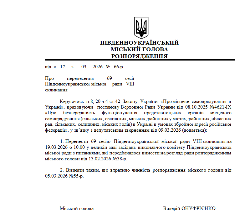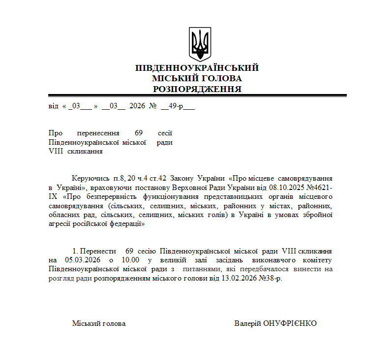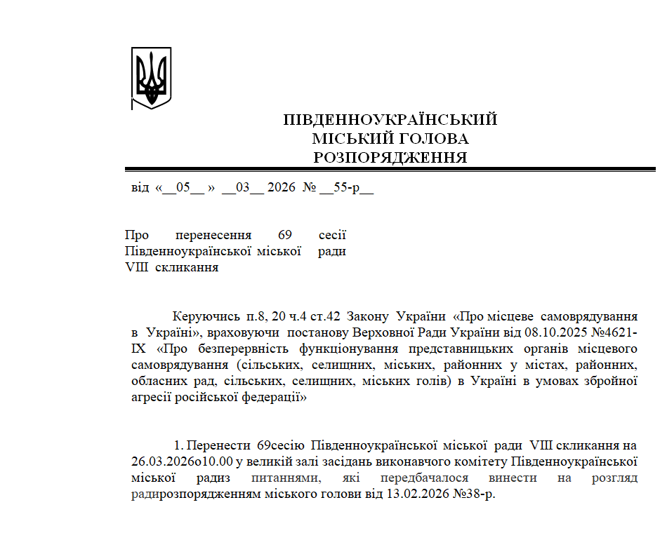 Позже на сайте Южноукраинского городского совета были опубликованы распоряжения городского головы, согласно которым заседание несколько раз переносили, начиная с середины февраля. 26 марта сессию в очередной раз перенесли на 9 апреля.