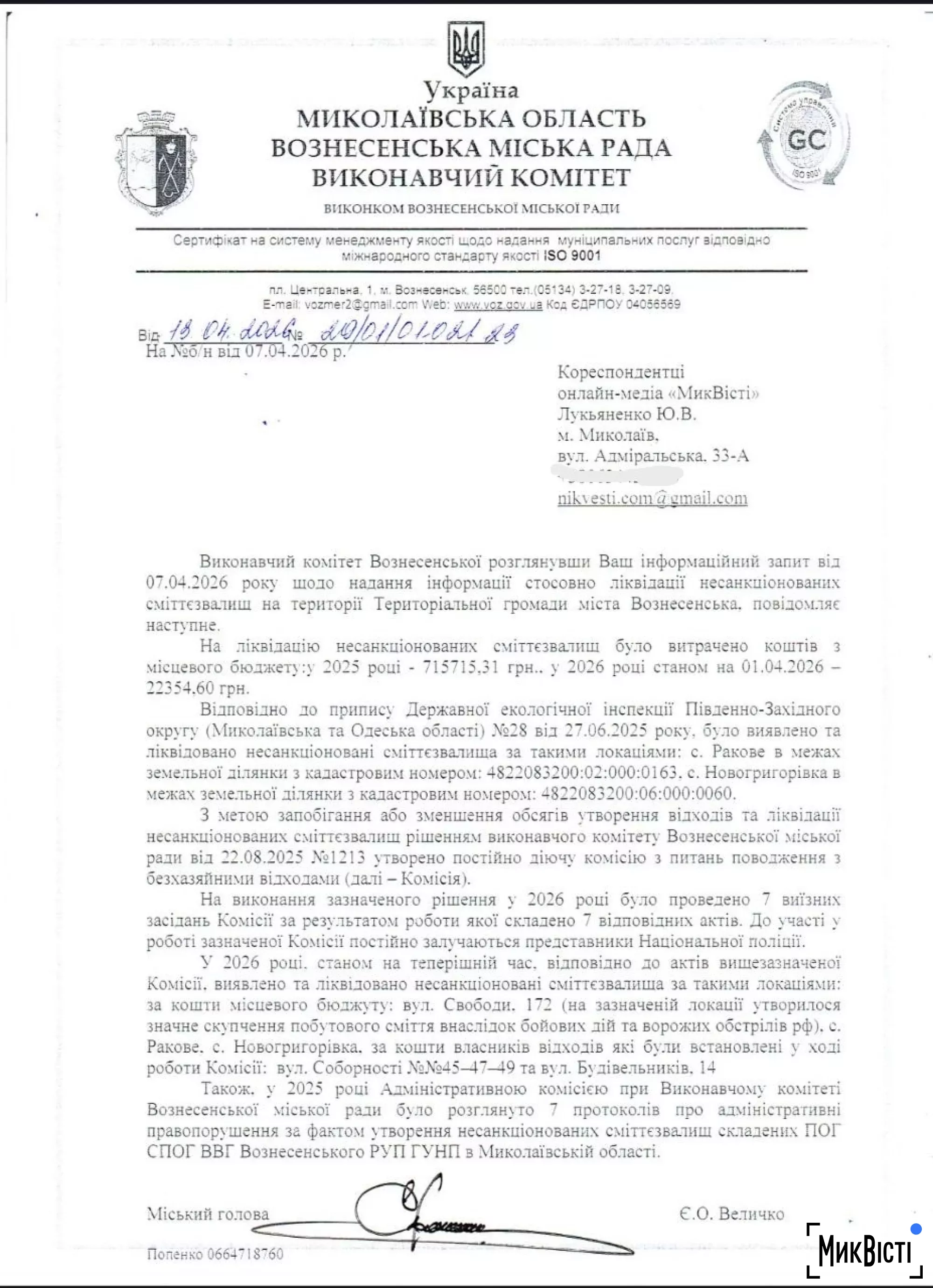 В ответе отмечается, что Государственная экологическая инспекция Юго-Западного округа вынесла предписание 27 июня 2025 года. В соответствии с ним ликвидировали несанкционированные мусорные свалки в селах Раково и Новогригоровка.