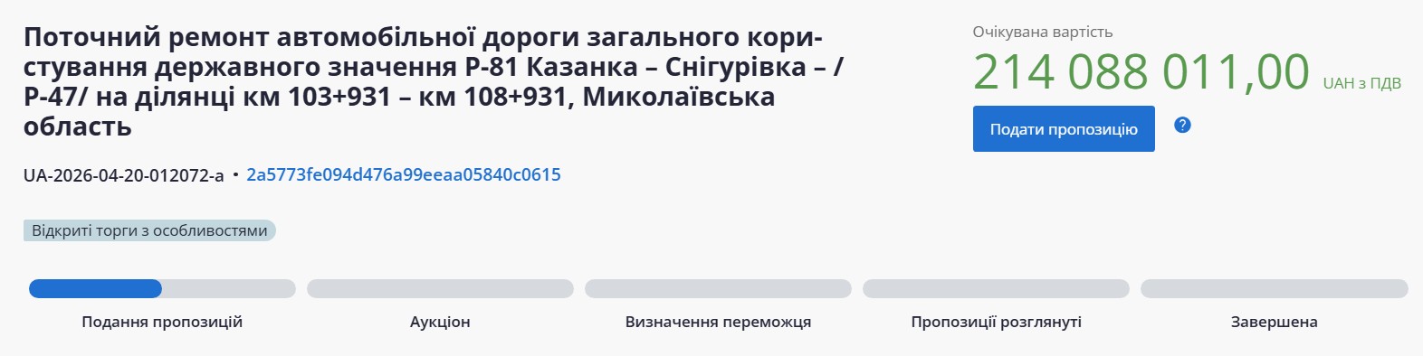 Также Служба восстановления и развития ищет подрядчика на ремонт участка км 103+931 – км 108+931 за 214 миллионов 88 тысяч гривен.