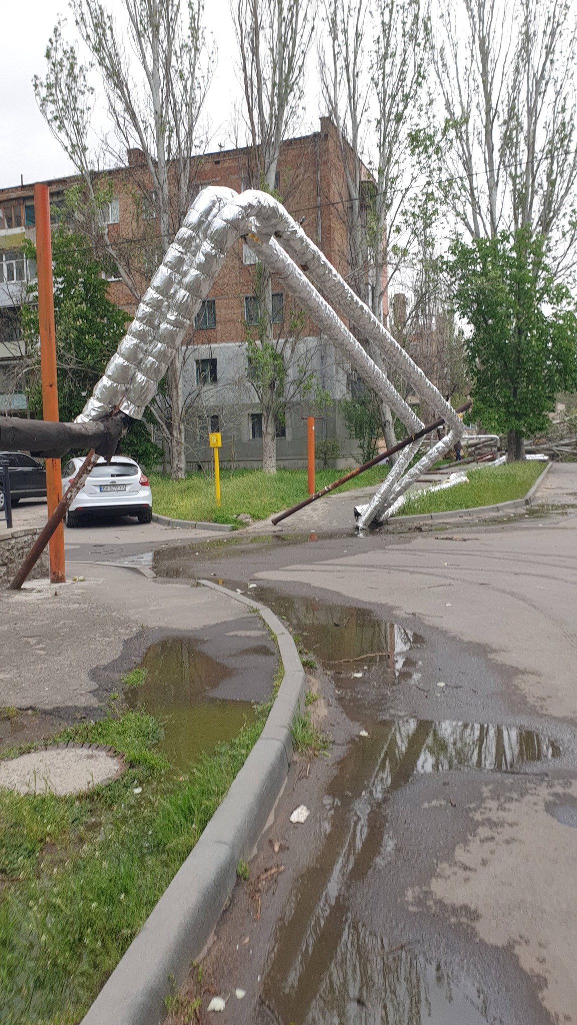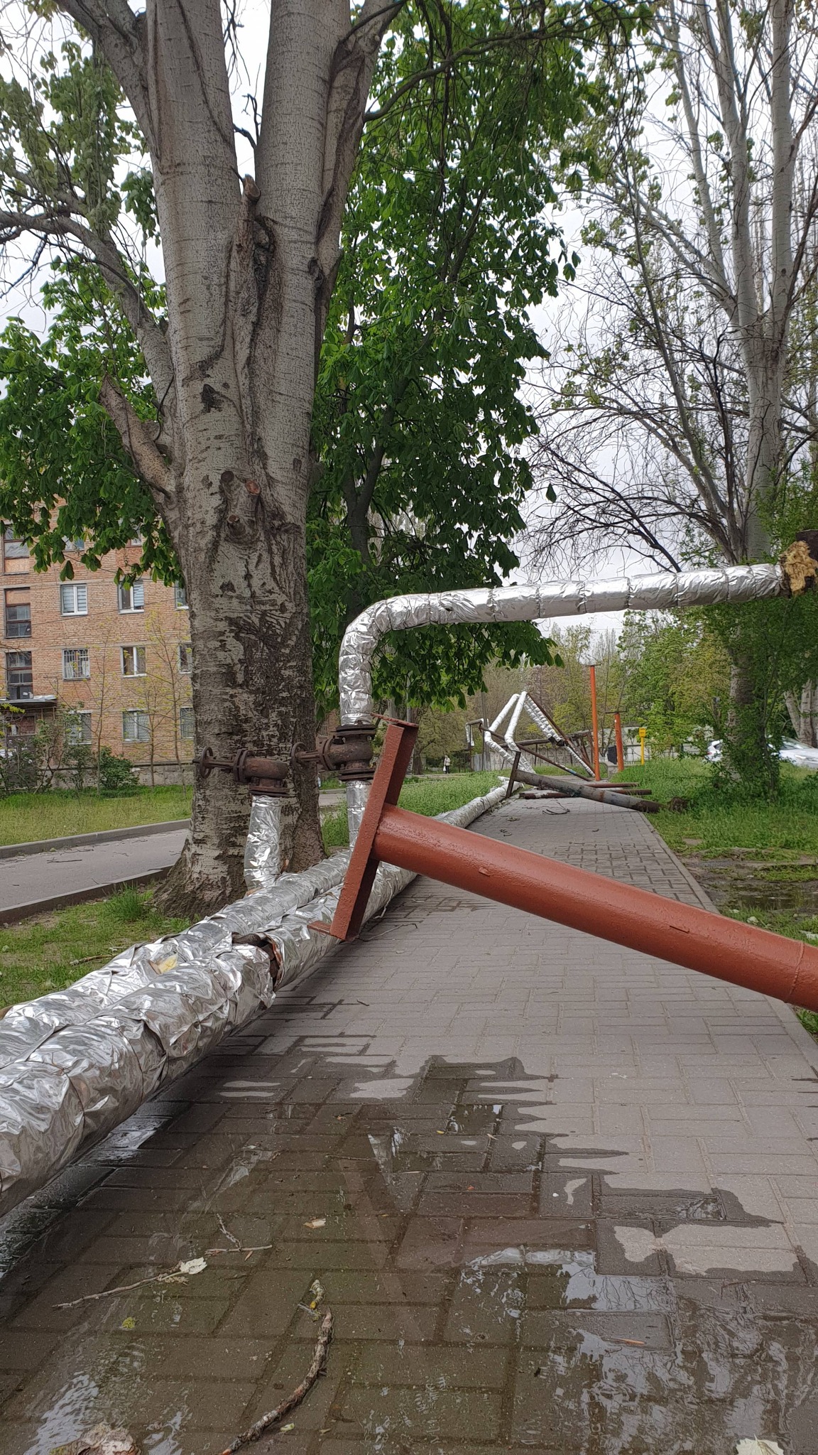 Инцидент произошел в микрорайоне Лиски, где из-за порывов ветра упали металлические опоры, на которых была закреплена надземная теплотрасса. В результате часть трубопровода оказалась на земле.
