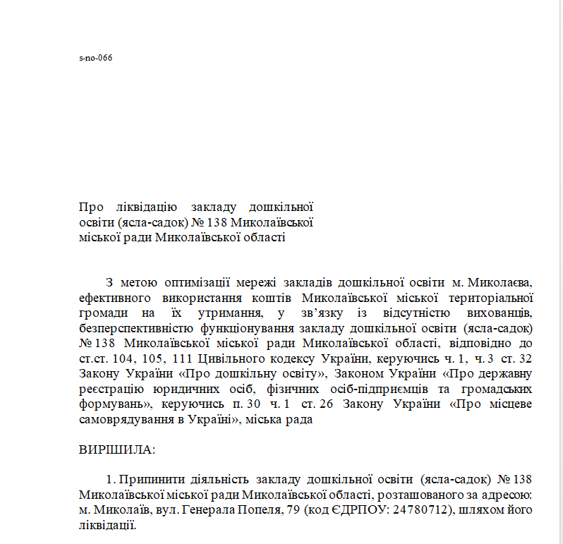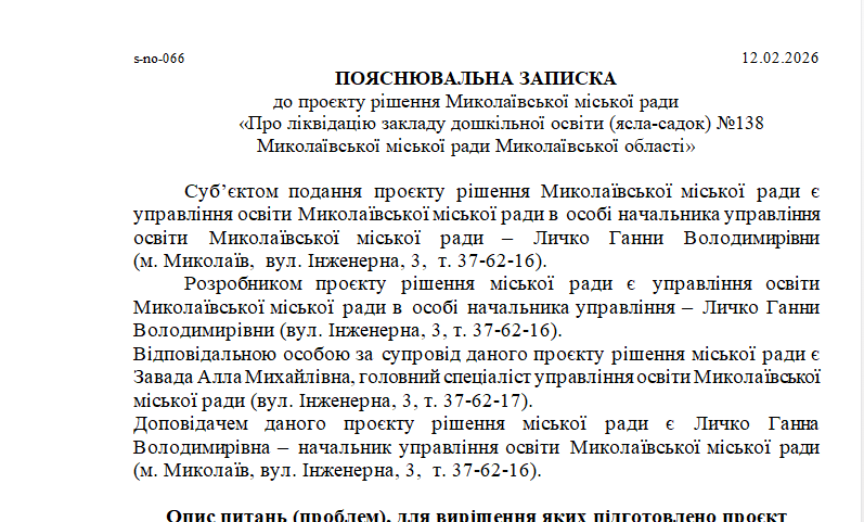 В проекте решения отмечается, что детские сады предлагается ликвидировать для оптимизации сети учреждений дошкольного образования г. Николаева, эффективного использования средств горсовета на их содержание, «в связи с отсутствием воспитанников, бесперспективностью функционирования учреждения дошкольного образования».