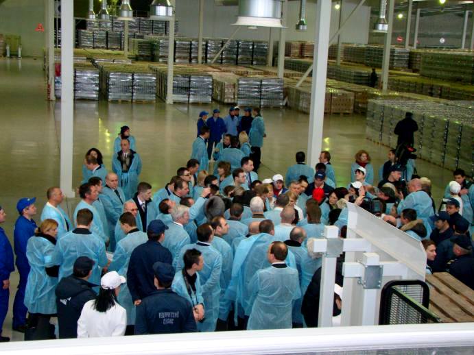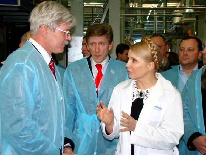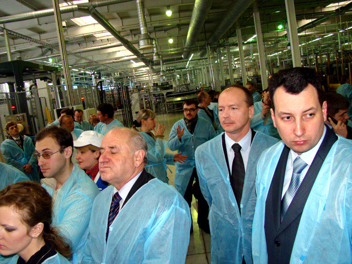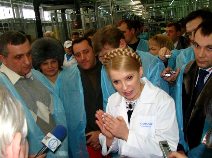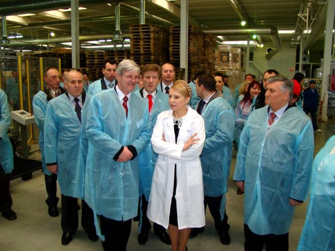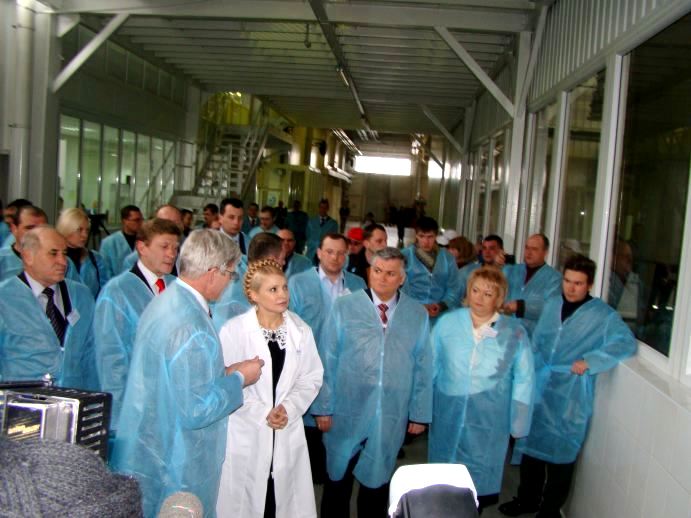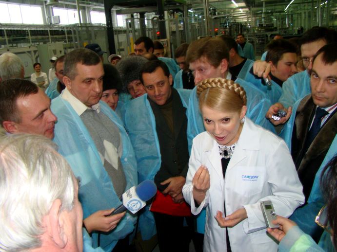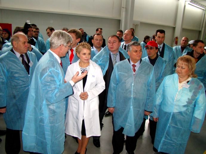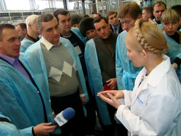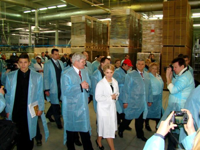Встретив гостью, «сандоровцы» тут же одели ее в белый халат с лейблом предприятия (всех остальных нарядили в синие). И повели показывать завод. Забзалюк не отходил от леди Ю ни на шаг. Охрану Премьер-министра взял на себя лично Владимир Уваров, который также сопровождал Юлию Владимировну на протяжении всего ее пребывания на заводе.