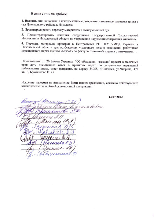 В своей жалобе николаевцы требуют выявить виновных в ненадлежащем доведении материалов проверки цирка в суд Центрального района Николаевской области, проконтролировать передачу материалов в суд, проконтролировать действия сотрудников ГЭИ по устранению нарушений содержания животных и передать материалы проверки в Центральный райотдел милиции г.Николаева для возбуждения уголовного дела по факту жестокого обращения с животными.