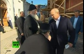 А поп монастыря, относящегося к Московскому патриархату Русской православной церкви потянулся к протянутой правой руке Путина, чтобы ее поцеловать.