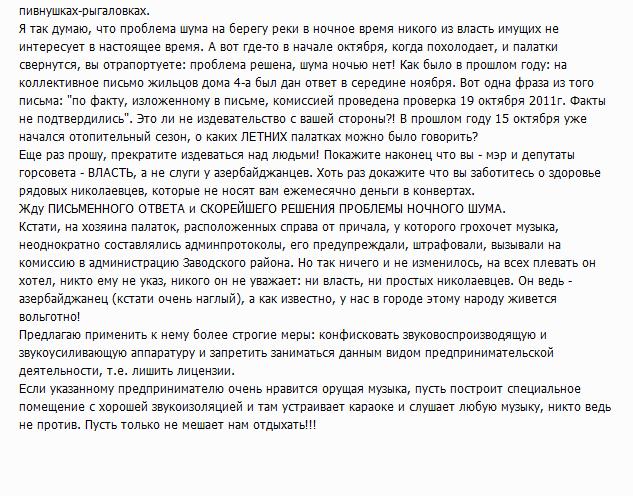 - Вам, наверное, очень выгодно, чтобы нашу молодежь спаивали! Так ведь проще, не нужно думать о создании новых рабочих мест для молодежи, особенно для тех, кто закончил учиться, получил диплом, а теперь шатается без работы. Кому наша молодежь нужна? Получается что только торгашам-азербайджанцам, которые обогащаются за счет николаевцев. А молодежь, от безысходности и пьет за родительские деньги, и гуляет по полночи. Ведь УВАЖАЮЩИЙ СЕБЯ ИНТЕЛЛИГЕНТНЫЙ ЧЕЛОВЕК не опустится до того, чтобы ночи напролет просиживать в этих пивнушках-рыгаловках, - пишет намывчанка.