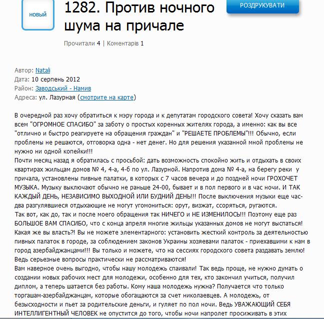 Жительница николаевского микрорайона Намыв, подписавшаяся как Natali, написала мэру Чайке, что за почти месяц с момента последнего ее обращения он так и не удосужился решить проблему шума от летних «пивняков» на прибрежной территории Намыв. Об этом она написала на личном сайте городского головы.