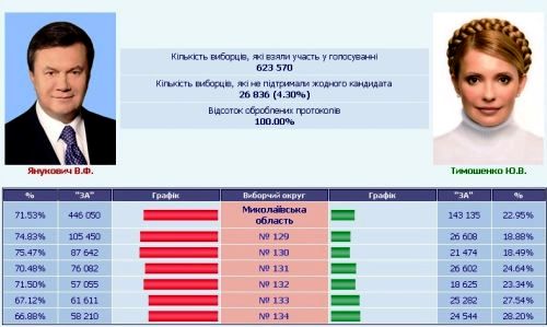ЦИК завершил подсчет голосов в Николаевской области. По данным обработки 100% протоколов, абсолютный лидер Виктор Янукович набрал 71.53% голосов. У Юлии Тимошенко – 22,95% голосов в Николаевской области. Против всех – 4,30%.