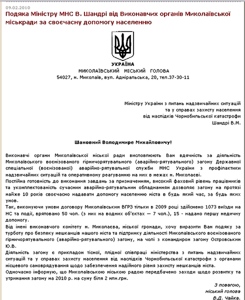 В своей благодарности Министру МЧС Владимиру Шандре за своевременную помощь населению Владимир Чайка отмечает: "от имени исполнительного комитета Николаева, городского общества, хочу выразить Вам благодарность за беспокойство о безопасности жителей нашего города и поддержке деятельности Николаевского военизированного горноспасательного (аварийно-спасательного) отряда, во главе с командиром отряда Островским Ю. В.