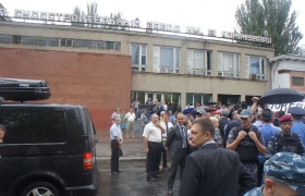 Собравшиеся требовали погасить долги по зарплате. Николай Азаров подошел к людям, чтобы пообщаться. Работники предприятия рассказали, что они не получили зарплату за 9 месяцев, завод не работает, а на имущество предприятия наложен арест.