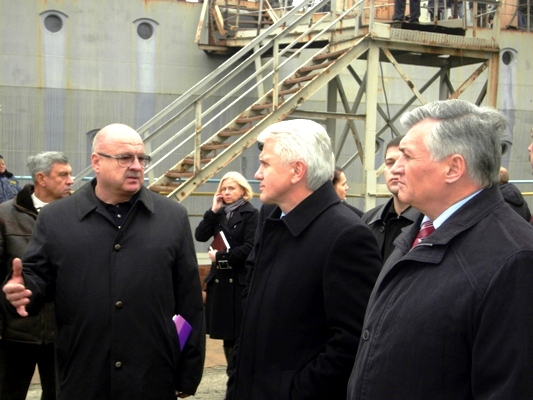 Гендиректор Судостроительного завода им. 61 коммунара Игорь Козырев (слева) и губернатор Николаевщины Алексей Гаркуша (справа) во время визита председателя Верховной Рады Владимира Литвина на завод 25 ноября 2009 года