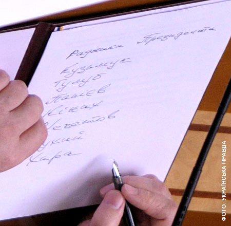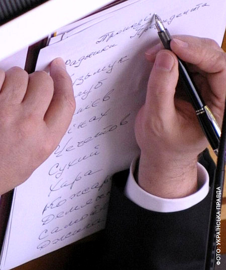 Как ни странно, но в фамилии своего подчиненного глава государства не сделал ни одной ошибки. Чего не скажешь о написании собственной должности. Корреспондентам «Украинской правды» удалось заснять то, как Янукович набрасывал на бумаге список своих советников. Документ называется «Радники ПрезиденИта». Кинах в нем – четвертый по счету. Бывшего николаевского губернатора в списке опередили Кузьмук, Тулуб и Папиев.