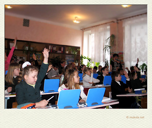 Были ловушки и в другом задании (исправить ошибки в небольшом тексте, «написанном» Буратино), но именно оно в полной мере продемонстрировало гостям из Херсона, каким образом построена работа с нет-буками. Ребята по подсказкам Ирины Будняк сначала подключились к сети (в любой точке этой школы – зона Wi-Fi), затем учитель сбросила им по сети требующий правки текст. А после выполнения задания (об этом «говорила» поднятая рука ученика) проверила на своем ноут-буке сделанную работу.