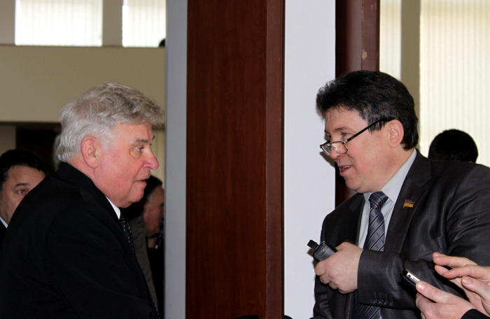 (19 марта) Два народных депутата: один настоящий (коммунист Владимир Матвеев), другой только в проекте, но уже со значком (справа Сергей Майборода)