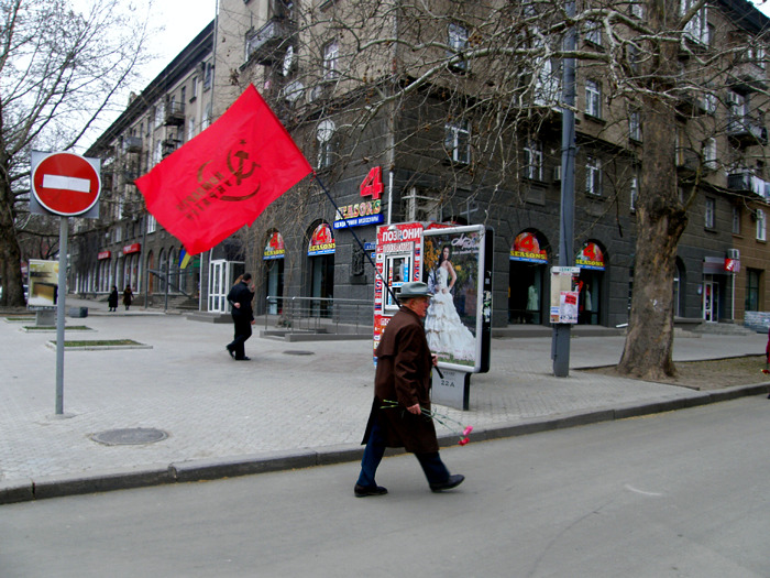На торжественный митинг дедушка идет по Советской с багряным флагом и гвоздиками