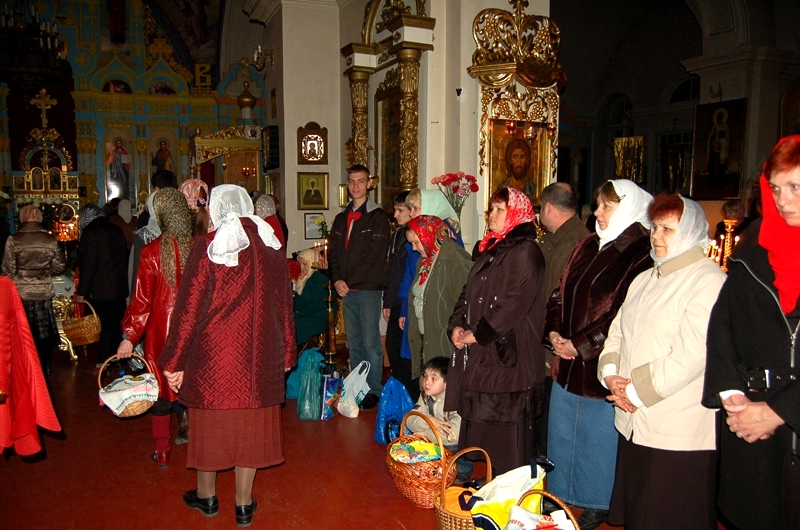 В Кафедральном Соборе Рождества Пресвятой Богородицы, что на улице Лягина в городе Николаеве, служба началась около 23:00. Людей в храме сначала было немного - они выстроились в два ряда с корзинами, в которых принесли с собой традиционные крашеные яйца, куличи и прочую снедь. Но со временем народ подтягивался. Как и полагается, люди ставили свечи, прикладывались к иконам и ждали заветного момента - начала Пасхи, символизирующей воскресение Христа.