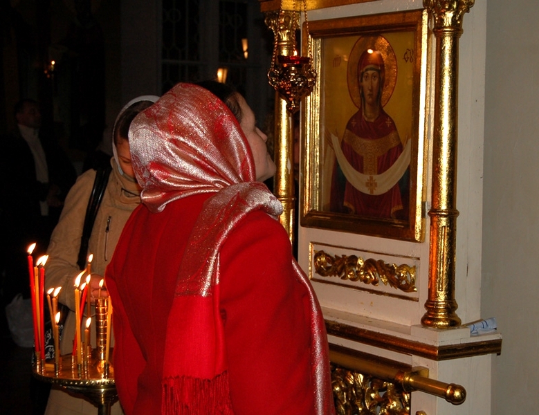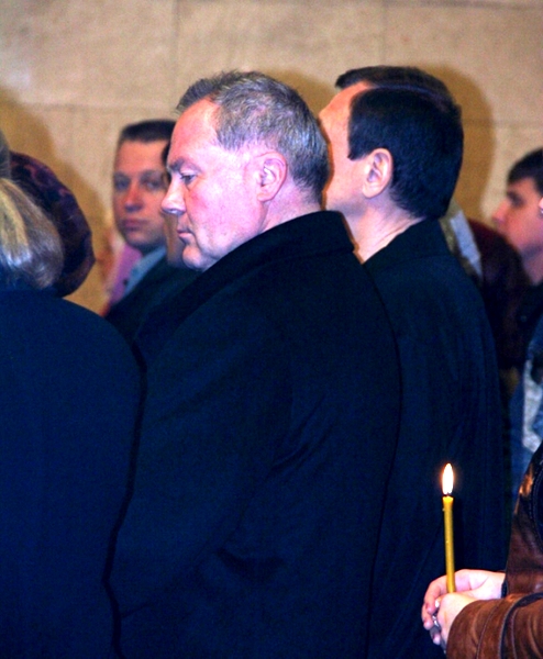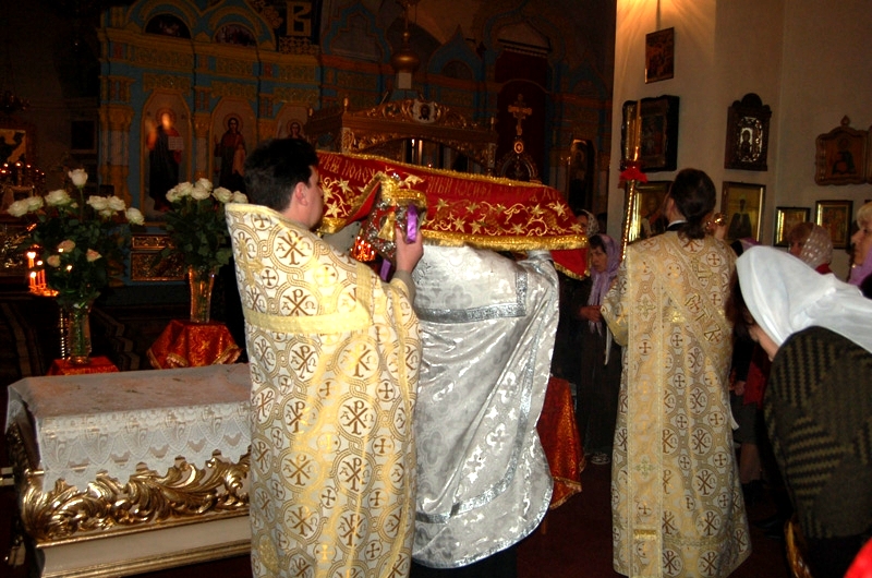 Прихожане также выстроились в два ряда по обе стороны от Царских Врат. Ближе к половине двенадцатого священнослужители во главе с Владыкой Владимиром сошли к Плащанице и, совершив каждение вокруг нее, подняли ее и отнесли в алтарь.