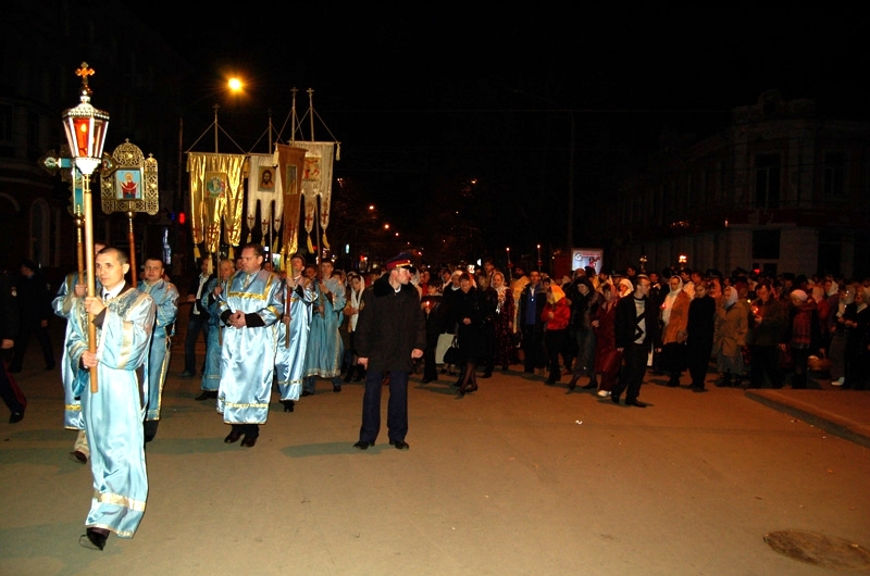 Незадолго до полуночи, в соборе наступило затишье. Время от времени ударял колокол, после чего люди совершали крестное знамение. Служители с хоругвями расположились у выхода из храма, и с наступлением новых суток начался традиционный крестный ход вокруг Собора (Лягина - Потемкинская - Советская - Большая Морская - снова Лягина). В шествии приняли участие несколько тысяч человек. Во время движения колонны порядок охраняли десятки сотрудников правоохранительных органов и представителей Николаевской паланки Запорожского казачества. Ожидали, что торжественное богослужение в Кафедральном Соборе Рождества Пресвятой Богородицы посетит и глава облгосадминистрации Николай Круглов, однако, губернатор так и не появился - ни в этой, ни в другой церкви.
