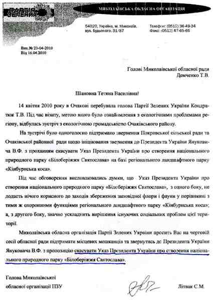 В своих выводах экологи практически одиноки. Даже Партия зеленых проголосовала за обращение к президенту и против национальных парков. В обращении к главе облсовета Татьяне Демченко (Партия регионов) глава областной организации Партии зеленых Литвак просит обратиться к Президенту с «предложением отменить Указ Президента Украины о создании национального природного парка «Белобережье Святослава».