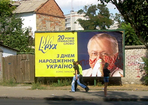 Раннее появление биг-бордов с изображением Б. Тарасюка вылилось в то, что к старту президентской гонки они изрядно «поизносились». Кое-кто из «доброжелателей» успел даже написать все, что он думает об этой политической силе. На фоне остальных «уличных фишек» биг-борды Руха в начале гонки смотрятся блекло.