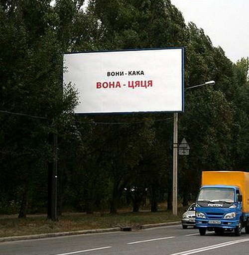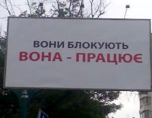 В августе улицы всех городов государства запестрели белыми растяжками и биг-бордами со странными, на первый взгляд, слоганами: «вони - блокують, вона - працює», «вони - балакають, вона - працює». Начислили пять вариантов того что делают «они», «она» же только работает. Лозунги «она работает», дали более ошеломляющий успех, чем хаки Яценюка. Очень уже сильный ассоциативный ряд вызывает сама постановка вопроса, чем могут заниматься «они», пока «она работает».