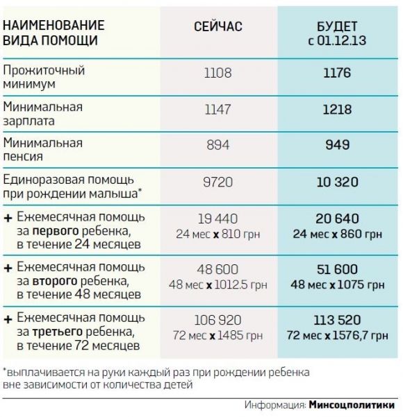 С 1 декабря в Украине, второй раз за этот год, повысят соцвыплаты. Например, помощь при рождении первого ребенка теперь составит 30 960 гривен (10 320 гривен — единоразовая помощь, и еще два года будет выплачиваться сумма в 20 640 гривен — ежемесячно по 860 гривен), а социальная помощь малообеспеченным людям составит 255,78 гривен (сейчас — 240,87 гривен).