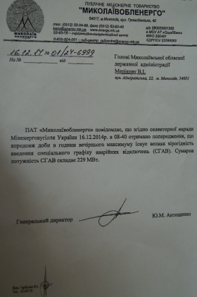 Указанные графики планируется применять с понедельника, 22 декабря, поскольку сегодня утром из центра Южной энергосистемы в ПАО «Николаевоблэнерго» поступила команда по подготовке к вводу графика аварийных отключений в Николаевской области объемом 155 МВт. По словам первого заместителя председателя облгосадминистрации Николая Романчука, 16 декабря руководство ПАО «Николаевоблэнерго» «письмом сообщило облгосадминистрации, что в течение суток в час вечернего максимума существует большая вероятность введения специального графика аварийных отключений, суммарная мощность которых составит 229 МВт».