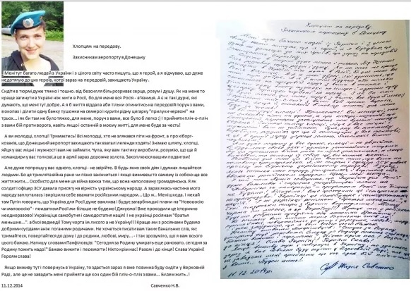 Боец батальона «Айдар» и народный депутат от «Батьківщини», похищенная в Донбассе и вывезенная в Россию, Надежда Савченко написала письмо защитникам донецкого аэропорта имени Сергея Прокофьева, среди которых сражаются десантники николаевской 79 отдельной аэромобильной бригады.