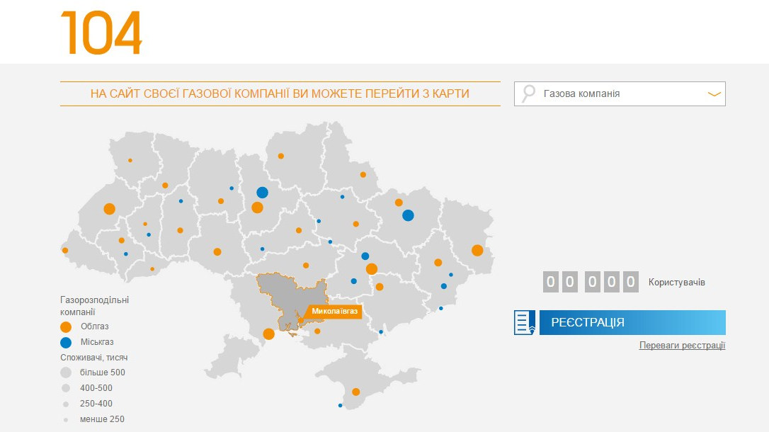 Преимущество портала «104.ua» в том, что пользователь в любом уголке Украины через интерактивную карту, размещенную на главной странице, может одним кликом мышки попасть на сайт своей газовой компании. Например, на корпоративных сайтах газовых компаний, работающих под брендом Региональной Газовой Компании, потребитель сможет познакомиться с действующими тарифами на газ, нормативными документами, советами по безопасному использованию газа в быту, оценить качество услуг газораспределительных компаний Украины.