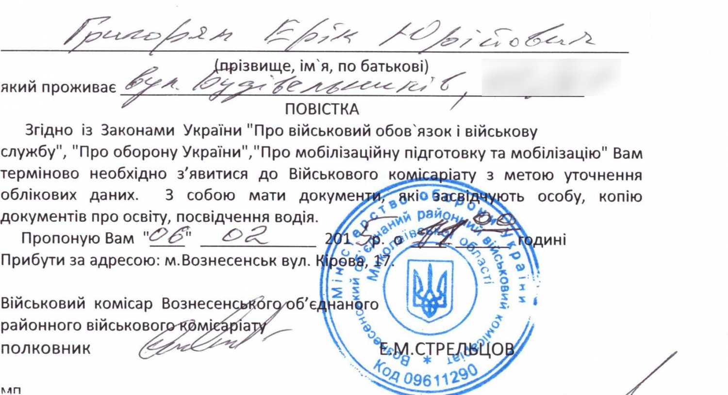 — Я, депутат Николаевского облсовета Григорян Эрик Юрьевич, добровольно 6 февраля явился в Вознесенский военный комиссариат. Военный комиссар полковник Стрельцов Е.М. лично вручил мне повестку. Считаю, что в связи с тяжёлой обстановкой в стране, каждый человек в настоящее время, независимо от занимаемой должности, должен явиться в военный комиссариат, выполнить свой гражданский долг и Указ нашего Президента, - заявил Эрик Григорян.