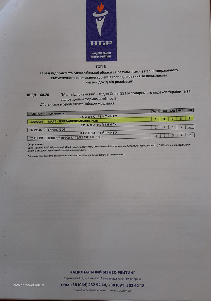 Телерадиокомпания «МАРТ» по итогам независимого оценивания Национального бизнес-рейтинга «Лидер отрасли 2015» заняла 1 место в Николаевской области среди малых предприятий в сфере деятельности «Телевизионное вещание» по показателю «Чистый доход от реализации», что соответствует Золоту рейтинга.