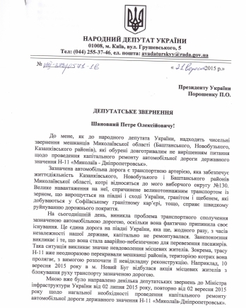 – А многочисленные обращения от жителей Николаевской области (Баштанского, Новобугского, Казанковского районов), которые возмущены тем, что не проводится капитальный ремонт указанной дороги и время от времени перекрывают трассу, заставило меня 21 сентября обратиться к Президенту Украины с просьбой решить вопрос о выделении средств на реконструкцию автомобильной дороги государственного значения Н-11 Николаев-Днепропетровск, – заявил народный депутат.