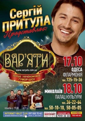 В субботу и воскресенье, 17 и 18 октября, телеведущий Сергей Притула, участник Comedy Club Украина, впервые везет юмор-шоу «Вар'яти» в Одессу и Николаев.