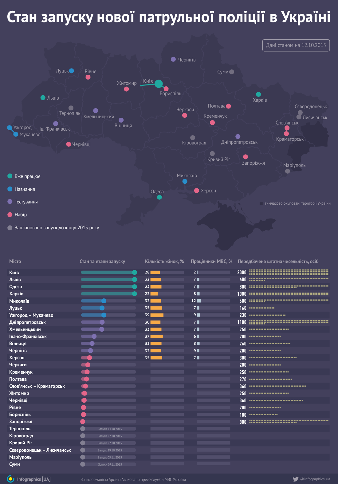 По состоянию на 12 октября, новая патрульная полиция полностью запущена в четырех городах Украины. Следующими населенными пунктами, где начнется запуск новой правоохранительной службы, станут Тернополь, Кировоград и Кривой Рог.